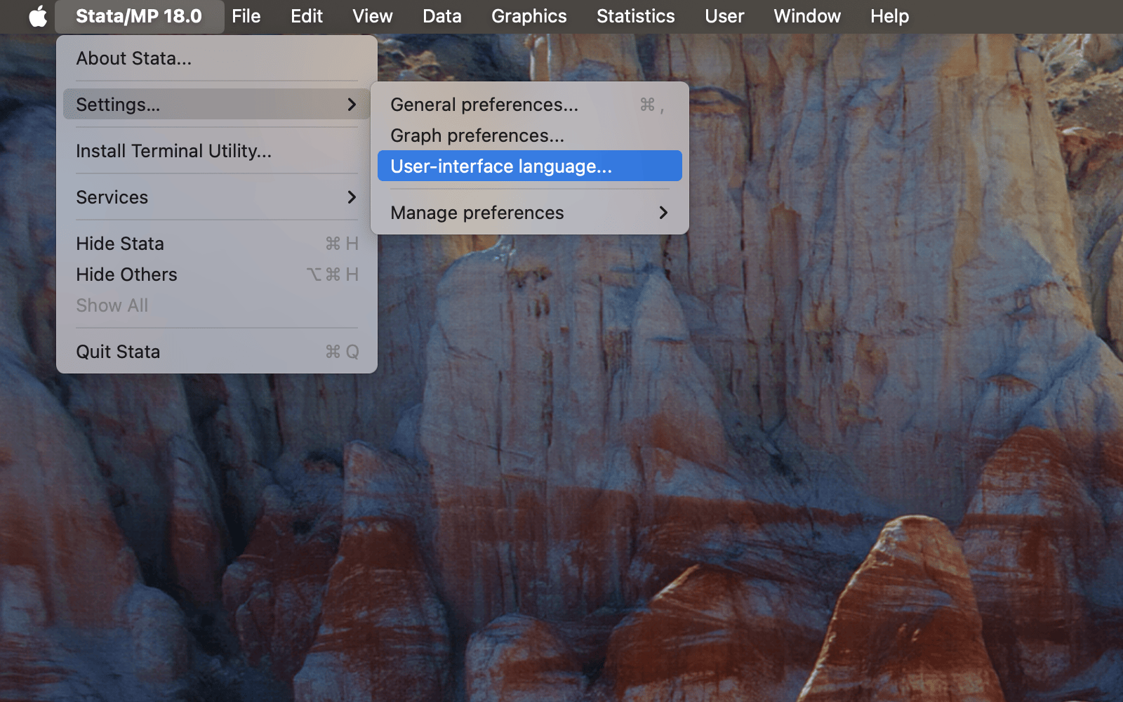 只需依次点击 Stata 18 顶部菜单栏:Stata/MP 18.0 → Settings... → User-interface language... 将 Language: 修改为 Chinese (China) 如何点击 OK 保存,按 command + Q 退出 Stata 18 再打开,这时就会显示中文界面了。