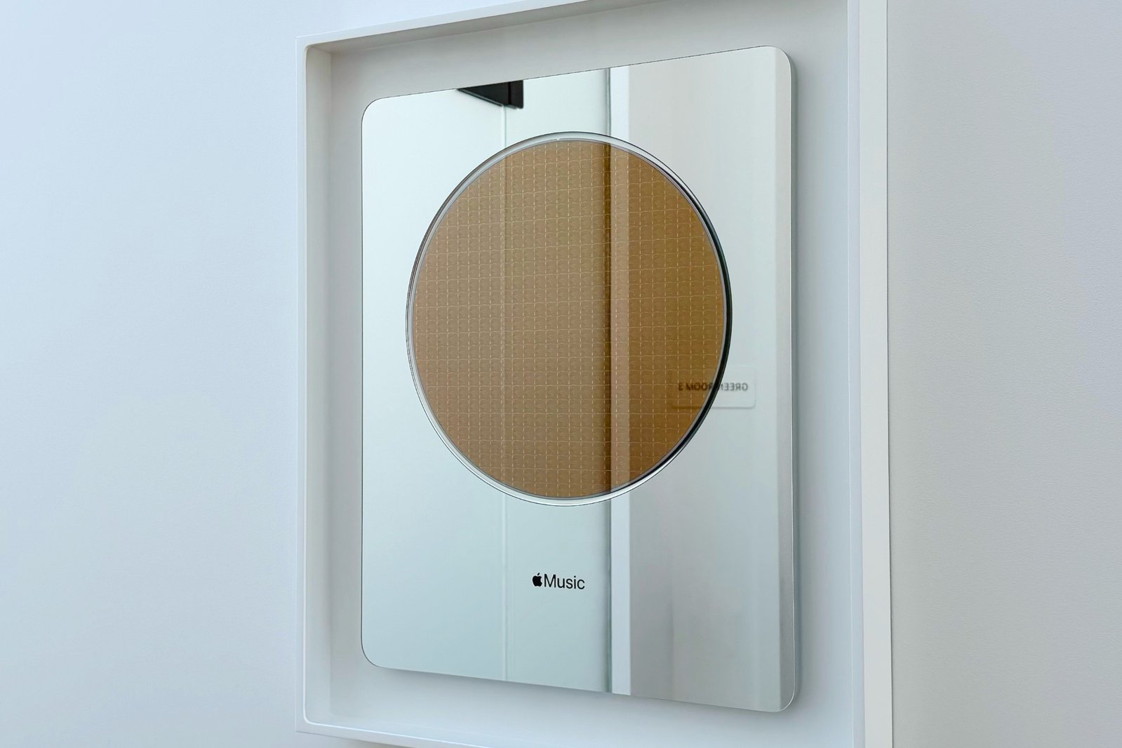 在走廊中我们见到了Apple Music奖杯。这块抛光铝制铭牌镶嵌定制苹果芯片晶圆与玻璃面板,闪耀夺目。