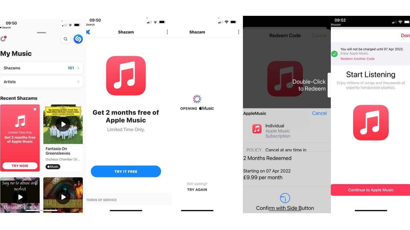 苹果的合作伙伴和子公司,如 Shazam,也提供不同时长的 Apple Music 试用。